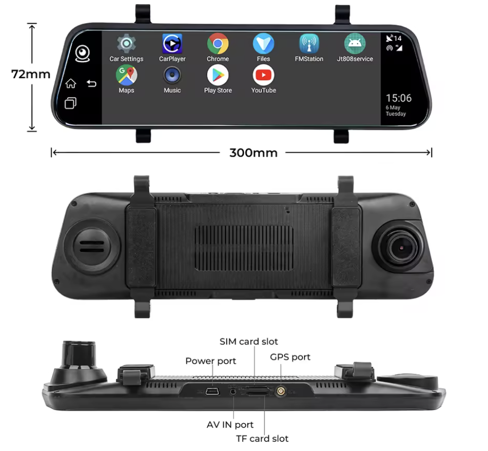 recorder that supports AI function DMS, ADAS driving behavior analysis, Android 8.1 system, 10.1-inch display, support for installation of third-party APK, GPS positioning, recording, intercom, and simultaneous support for most fleet management systems on the market. It has self-developed free wireless terminal APP, such as: CMSV7/CMSV6/gps51 and other fleet management systems and supports the provision of SDK packages for secondary development.
